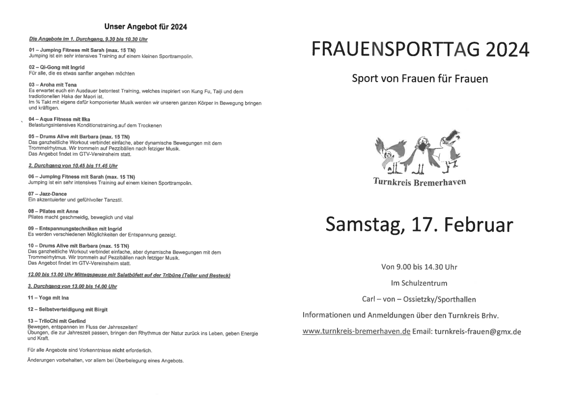 Und wieder einmal war es soweit. Frauensporttag am 17.02.24 in den Sporthallen des Schulzentrums C.v.O und des GTV. Viele Frauen waren anwesend, wir konnten 80 zählen. Gelungen war der Auftakt. Alle Übungsleiterinnen haben sich vorgestellt und Stefan Axmann hat die Grüße des Amtes für Sport und Freizeit überbracht.